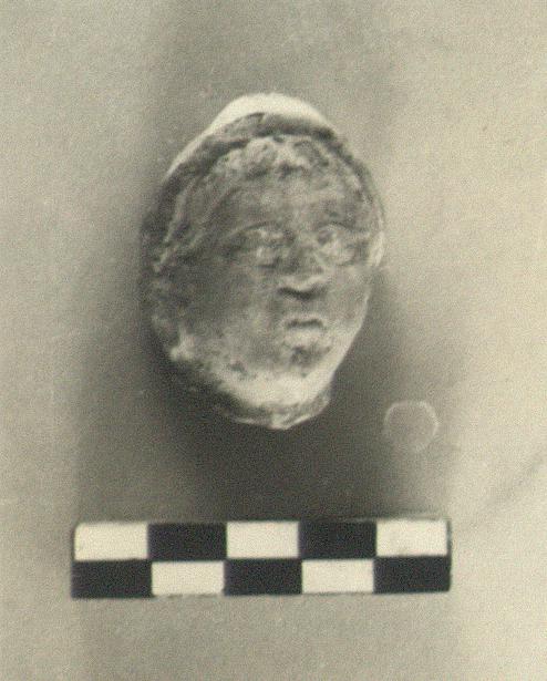 | Description: | Broken behind and at neck. A full face. The head is covered by a veil which leaves only a fringe of hair exposed Traces of white and red paint on garment. White color for eyes, red for flesh. | |