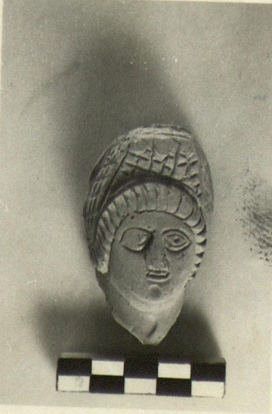 | Description: | Only the front part of the head preserved; broken at vertical join of neck. Details of features and high basket headdress rendered by linear incisions. Unglazed. Orange clay, slightly micaceous. ADDENDA: Same mold as T 3103. Late Roman. | |
