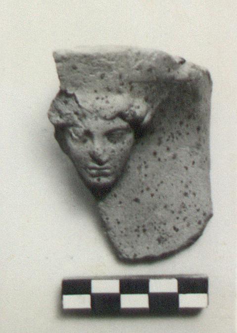 | Description: | First interpretation: woman 's head in relief; of good period and style. Top and back edge finished; broken below and to left. There never was more than a head: the neck is not modelled. Moulded. Unglazed. Meant to be affixed behinda mask, or protome (?) Fine highly micaceous brownish-buff clay; with grayish core. Another fragment, found later and joining to the left, connects this piece with the similar head numbered T 786. There are neatly finished holes, between each pair of heads, at the level of the neck. Now joined to the left of T 786. | |