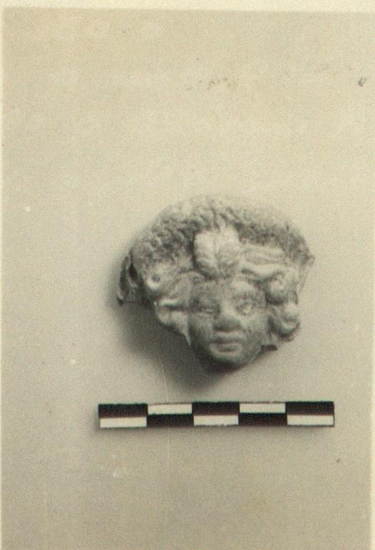 | Description: | First interpretation: female head. Broken away at back and below. Thick curling locks surround the face except at the top where there is a heavy lengthwise broad. The hair is surmounted by a thick round wreath. Traces of red paint, white in the eyes. Orange red clay. Late Roman. ADDENDA: Eros figurine (?) | |
