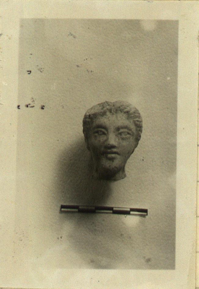 | Description: | Woman 's head with earrings (?). The heavy hair is gathered into a large knot behind, the locks rather rudely retouched. Traces of red paint. Buff clay. | |