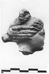 | Description: | Woman 's head broken off at neck. Hair brushed back in large locks to a small sharply projecting knot. An elaborate construction (wreath, or curls ?) on the top of the head. Traces of red paint on hair. Grayish buff clay. ADDENDA: Narrow eyes. Traces of white paint on face. Blond-smoked clay. | |