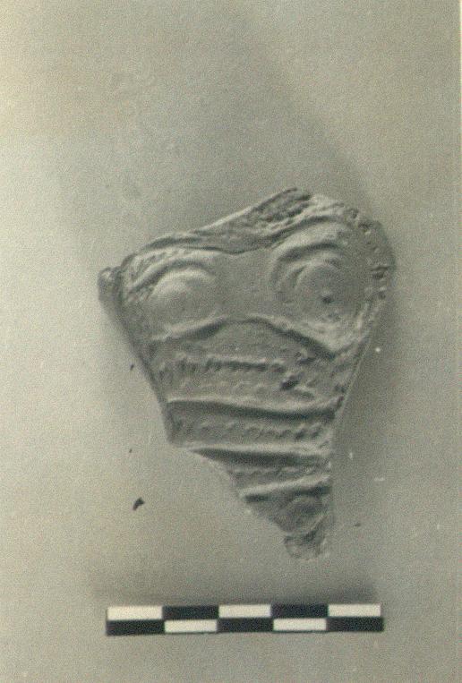 | Description: | Preserved nearly to the edge of the mold on both sides; broken top and bottom. A torso wearing an elaborate cuirass. Micaceous red clay. Late Roman. ADDENDA: C. Grandjouan: Possibly woman gladiator. Cf. T 1377. | |