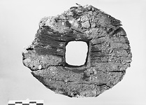 | Description: | Thick round piece with concave edge for the rope, which has left traces of wear. Through the middle, a square beam cutting. | |