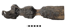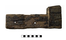 Description:   Two posts, a plank-like fragment with two holes cut through it, and at least seven other fragments remain.