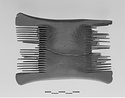 A double comb with finer teeth (31) at one end and coarser at the other (20). Thicker at middle than at ends. Long sides slightly concave. The central space between the teeth decorated on one side with large egg and dart pattern. On other side there seem to have been only two or three lines along base of teeth.