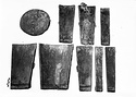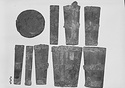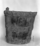 | Description: | All the staves found, considerable portions of the iron bands. Made of sixteen staves, bound by three horizontal bands, at top, bottom and middle; these connected on either side by a vertical band, for the handle attachment. The handle, held by vertical iron straps, is missing. | |