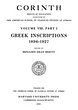 Publication: Corinth VIII.1 | Title: | | Greek Inscriptions, 1896-1927 | | Author: | | Meritt, Benjamin D. | | Abstract: | | The text of all 331 Greek inscriptions found during the course of excavations at Corinth from 1896 to 1927 is presented in this volume, including some pieces found in fields around the city. The book is divided into sections of Laws and Decrees, Catalogues and Boundary Stones, Public Monuments and Dedications, Sepulchral Monuments (Greek, Roman, and Byzantine), and Byzantine Monuments other than Sepulchral Monuments. | | Series Title: | | Corinth | | Publication Place: | | Cambridge, Mass. | | Publisher: | | American School of Classical Studies at Athens | | Volume: | | 8.1 | | Date: | | 1931 | | Page: | | 1-180 | | Jstor: | | http://www.jstor.org/stable/4390668 | | Google: | | http://books.google.com/books?id=eTcMAQAAMAAJ | | DOI: | | 10.2307_4390668 | | | | 10.2307_4390669 | | References: | | Publication Pages (188)